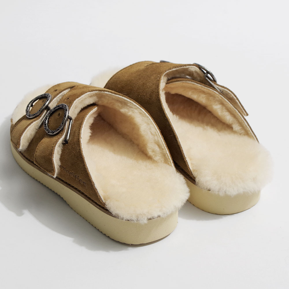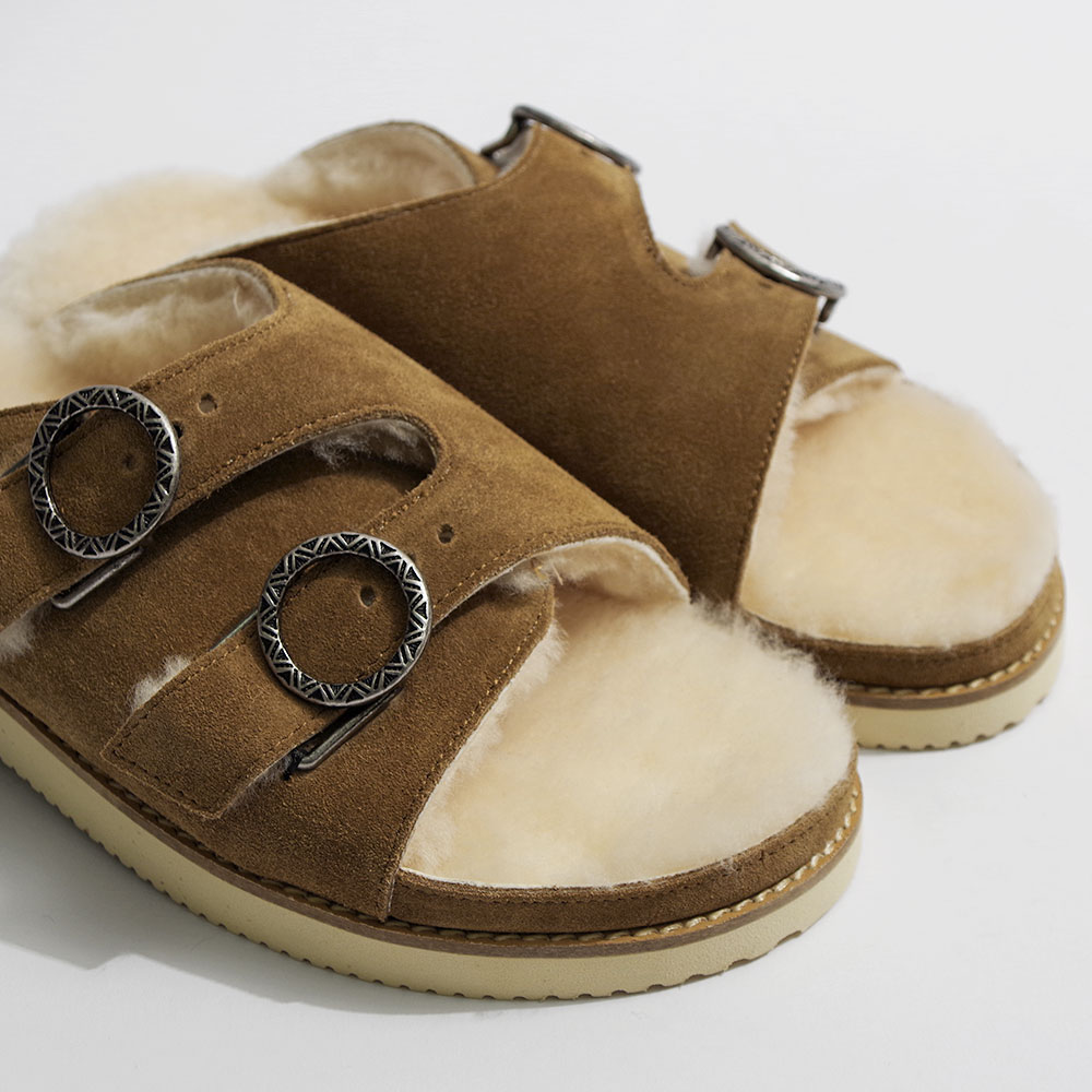 こちらは牛革と天然の羊毛ムートンを使用したダブルストラップデザインが特徴的なサンダルです。