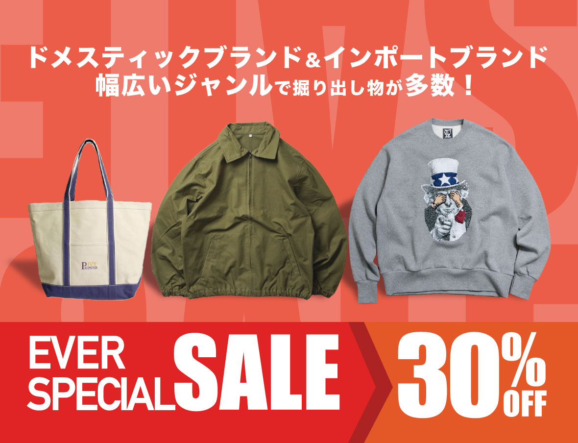 Ever Special Sale スライドバナー用 2026.01.30 コメント: 0 Tweet Share Hatena Pocket feedly Pin it RSS 関連記事 【SAVE THE GOODMAN セイヴザグッドマン】Graphic Art Tee “vinal” グ... 【SALVAGE PUBLIC サルヴェージ・パブリック】E Denim French Terry Coach Jacket ... 【Nasngwam ナスングワム】QUIET JACKET クワイエットジャケット 【CULTURES カルチャーズ】PEACE SIGN S/S Tee ピースサイン 刺繍 半袖Tシャツ 【LIFEWEAR(ライフウェア)】Made In USA TURTLENECK L/S PKT Tee メイドインUSA タ... 【COMMON EDUCATION コモンエデュケーション】BIG POCKET COACH JKT ビッグポケッ... 【USA Made DEADSTOCK(アメリカ製デッドストック)】 USA製 Norman Rockwell WIND U... 【COMMON EDUCATION(コモンエデュケーション)】TYPE 3 DENIM PANT onewash タイプ3... コメント コメント ( 0 ) トラックバックは利用できません。 この記事へのコメントはありません。 コメントするためには、 ログイン してください。
