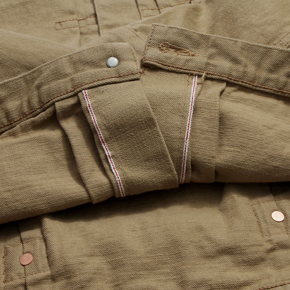 生地はセルビッチ付きの12ozスラブデニムです。縦、横共にベージュに染色した番手違いのムラ糸(7番×10番)を力職機で織りあげたオリジナルデニムになります。
