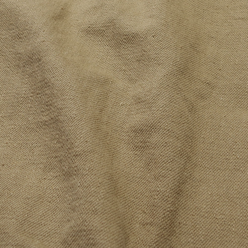 通常デニム地は横糸に晒糸(白)を使用し綾織りで織りあげられるのがポピュラーですが、横糸もベージュに染めたことで生まれる奥行きのある色目と、手織りで織られたような独特の感覚の風合いが特徴です。