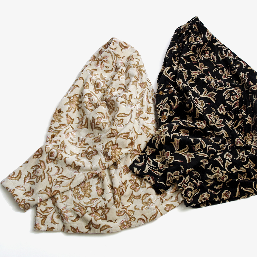 ベロア地に織りで表現されるボタニカルな柄が立体的な表情で、スタイリングに個性をプラスしてくれる唯一無二の存在感。