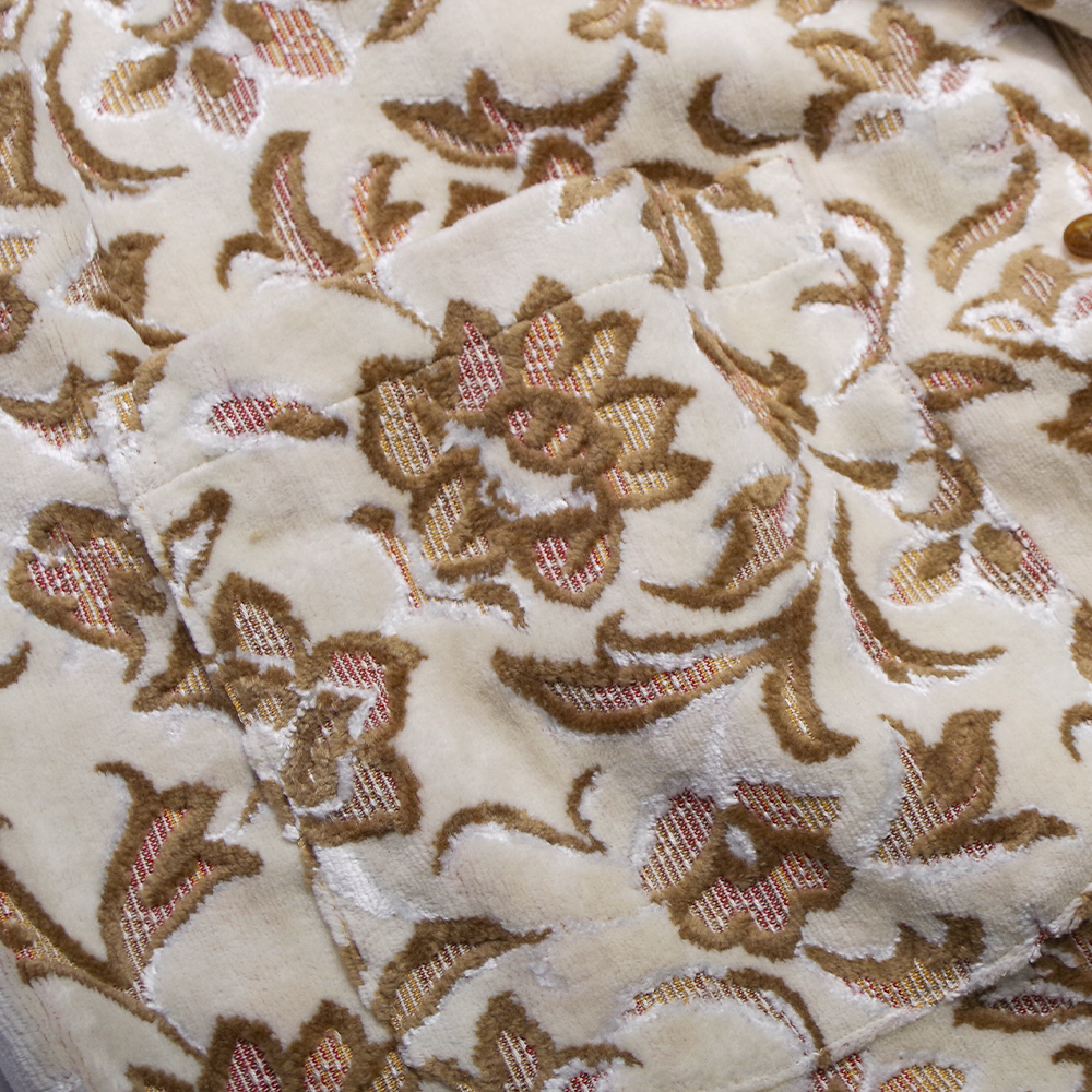 衣料用ではなくおそらくインテリア用に製作されたであろう意匠に凝った贅沢な仕様のゴブラン織り生地をあえてウェアにすることでこのブランドらしい個性的なアイテムに仕上がっています。実際に生地を見ていただくとその凝った素材感で、おそらく高級なインテリアファブリックとして生産されたであろうことが窺えます。