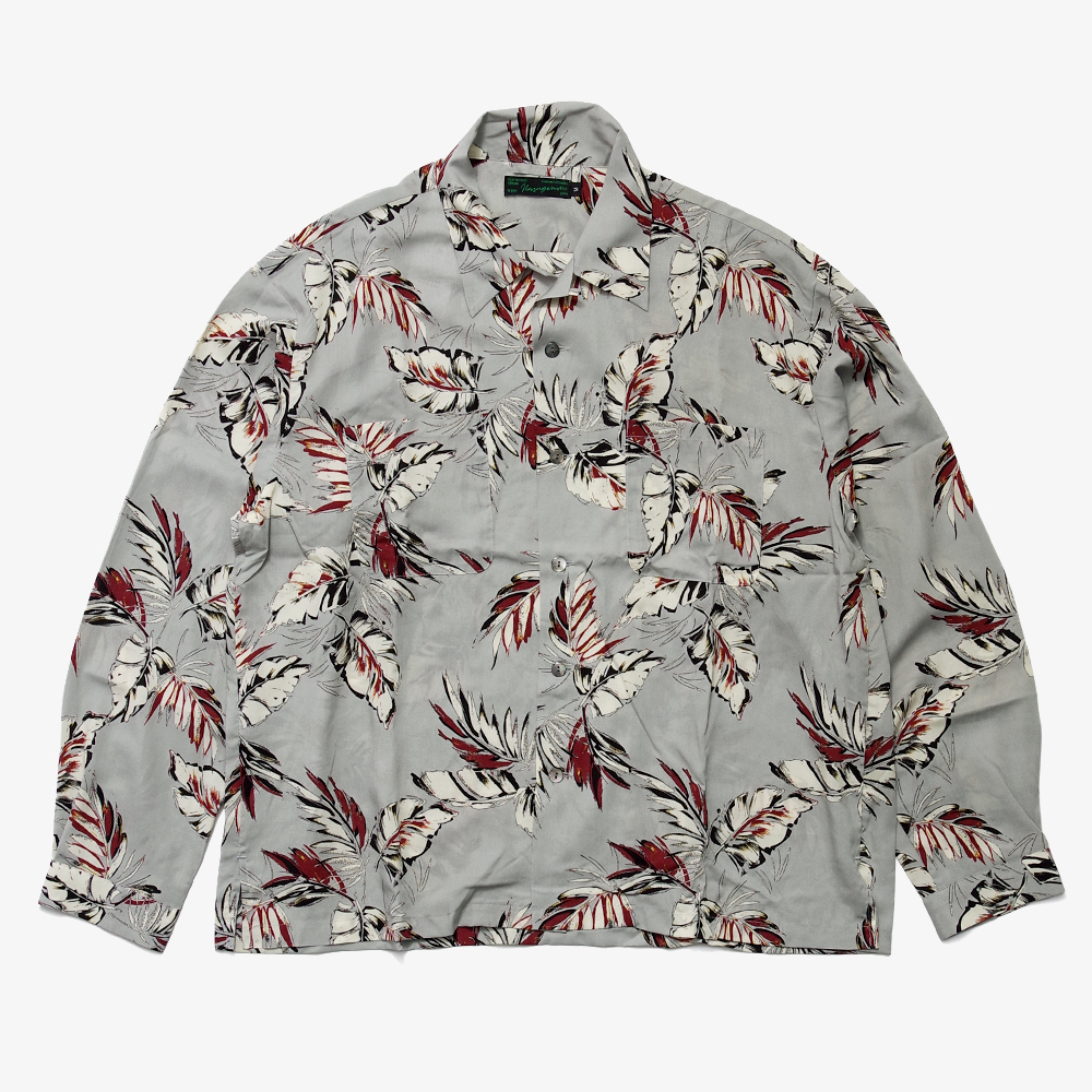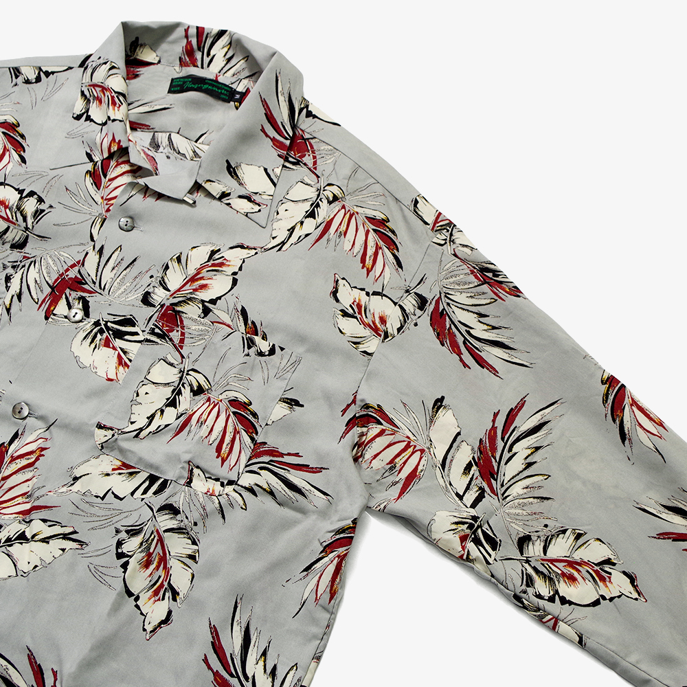 こちらはデッドストックで見つけたリーフ柄レーヨン100%の生地を使用した長袖のアロハシャツです。