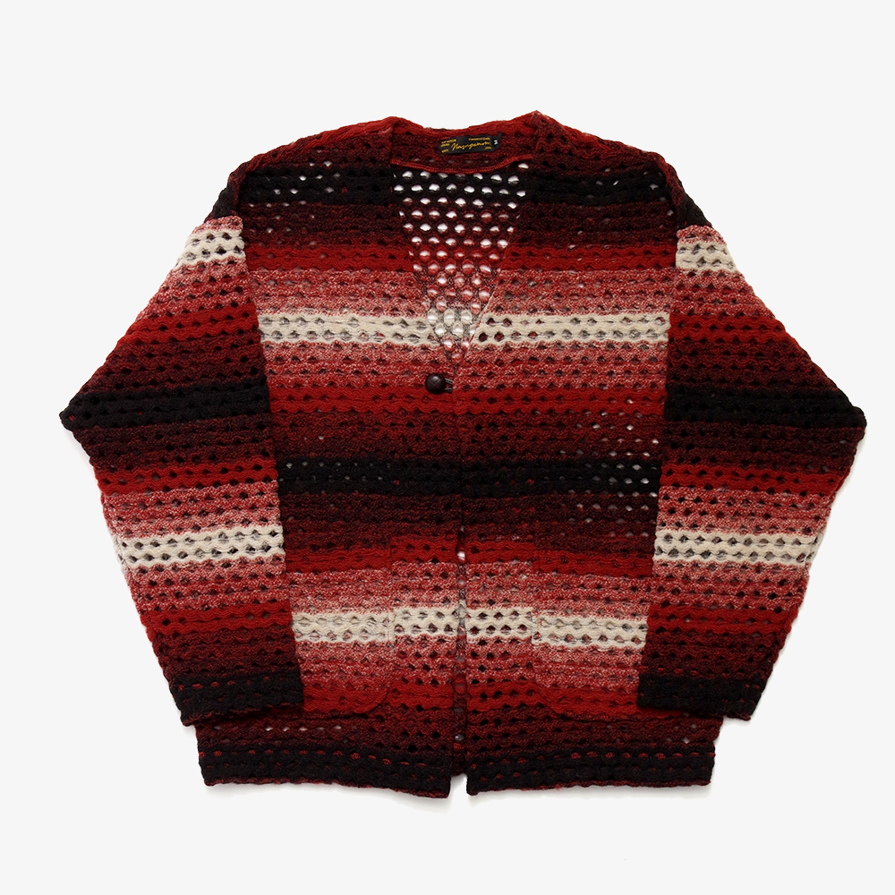 こちらは目の粗い鈎編みのような手法で成形された個性的なニットカーディガンです。カラーも絶妙なカラーリングのグラデーションを表現しています。