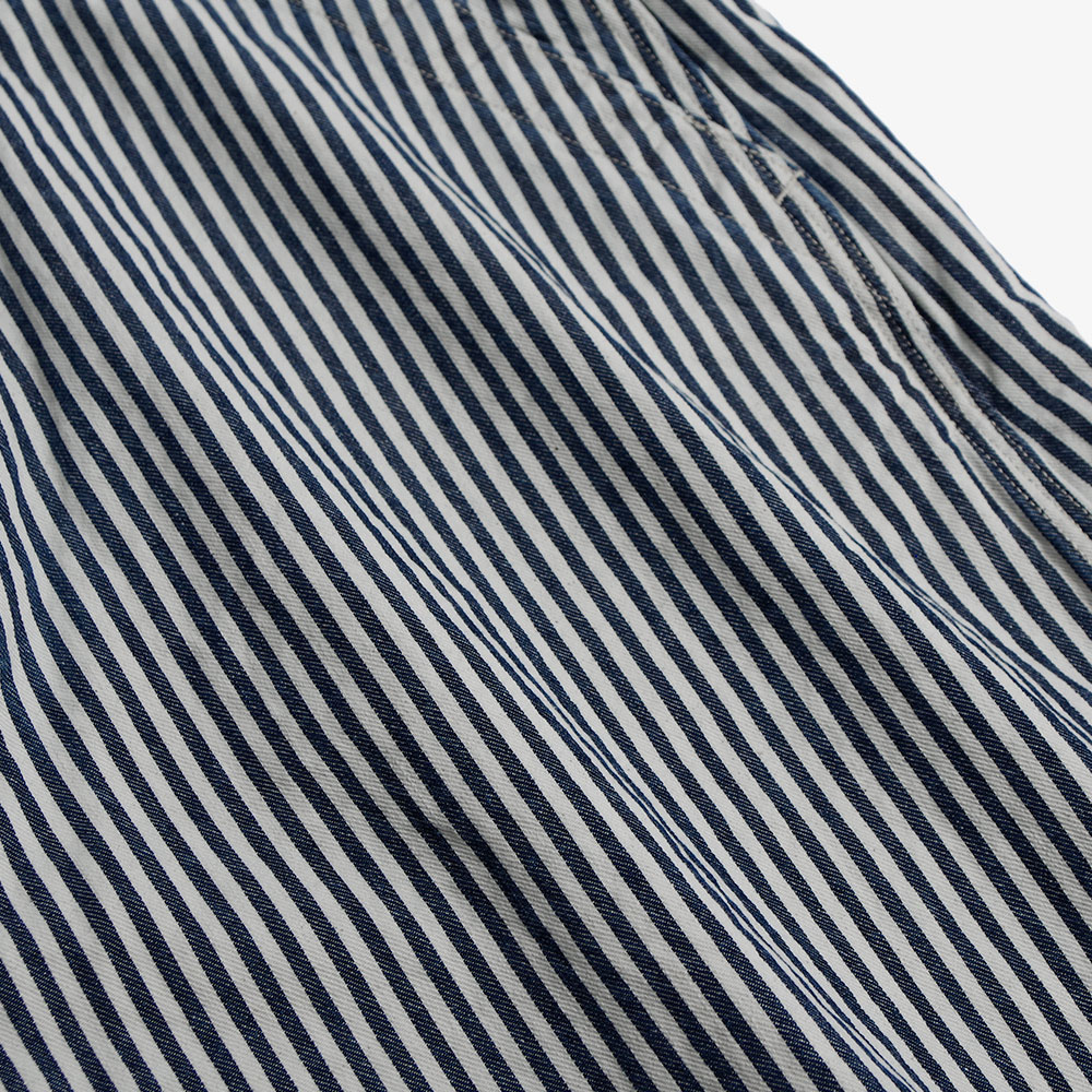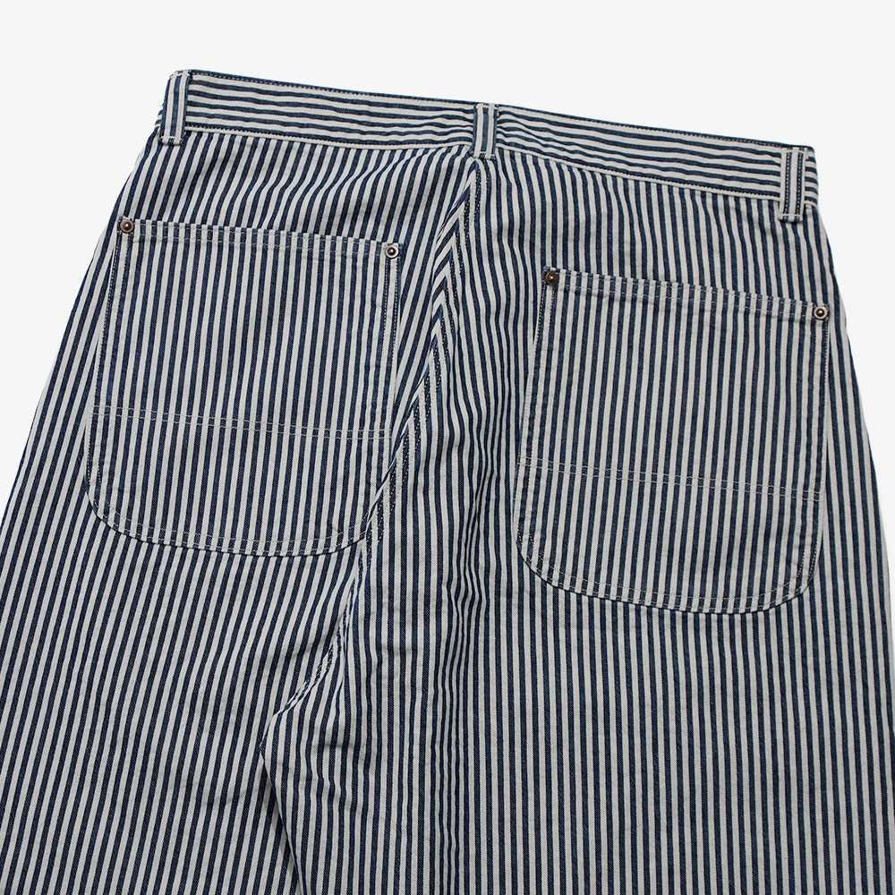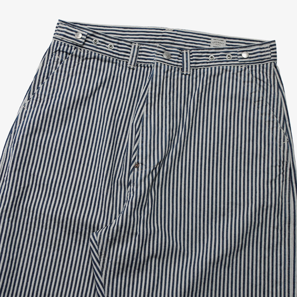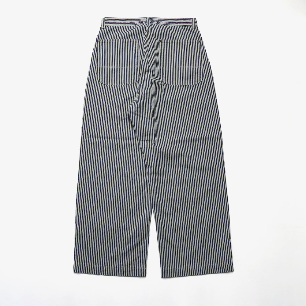 コチラは2023SSコレクションより登場で、大好評いただいているデニムのベルパンツをワークウェアに使用されるヒッコリーストライプ地で製作したモデルです。