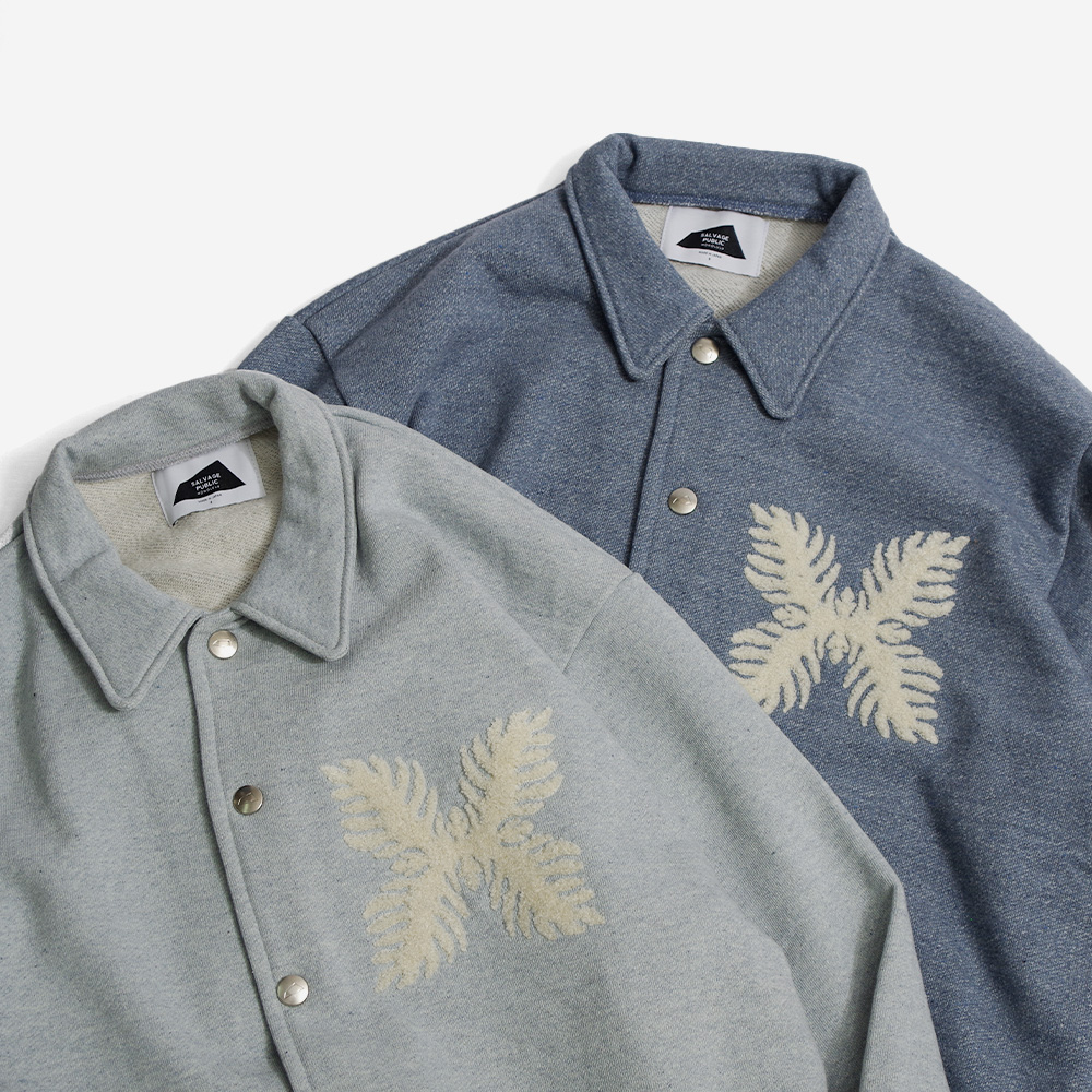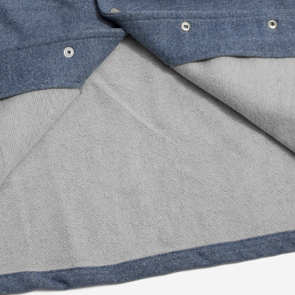 不要になったデニムを回収し、リサイクルコットンと合わせて反毛(生地などをワタの状態に戻すこと)したものに、さらに50%のヴァージンコットンをブレンドして紡績し糸を作成。元のデニムのカラーを活かした糸ができあがり、それを和歌山にてスウェット素材に編み立てた生地を使用したコーチジャケットです。