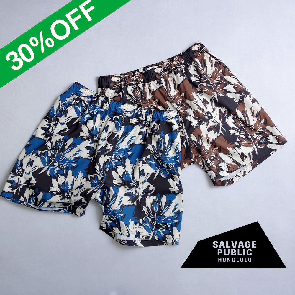 【SALVAGE PUBLIC サルヴェージ・パブリック】HIBISCUS CAMO Swim Shorts ハイビスカスカモ柄 スウィムショーツ