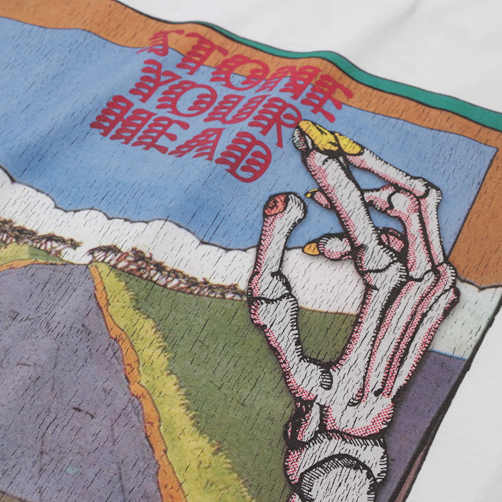 こちらは絵画的でありながら不思議なコラージュが施されたデザインは「石頭のあなたには理解できないでしょう?」というメッセージが込められたデザイン。またダブルミーニングとして別の意味合いも込められていますが、それはご自身でお調べください。ヒントは何かの状態を隠語として『STONE』と表現するスラング。