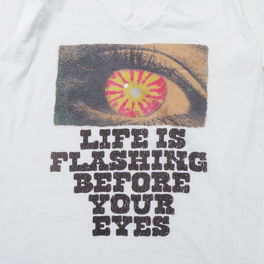 昨年大好評で再生産してもらったデザインをアップデートしてアメリカ軍のデッドストックのコットン100%ボディにプリントしたモデルです。またVネックというのがポイント。そろそろ市民権が復活の兆しのVネックTeeシャツにこのブランドらしいアートグラフィックが映えた逸品です! |
