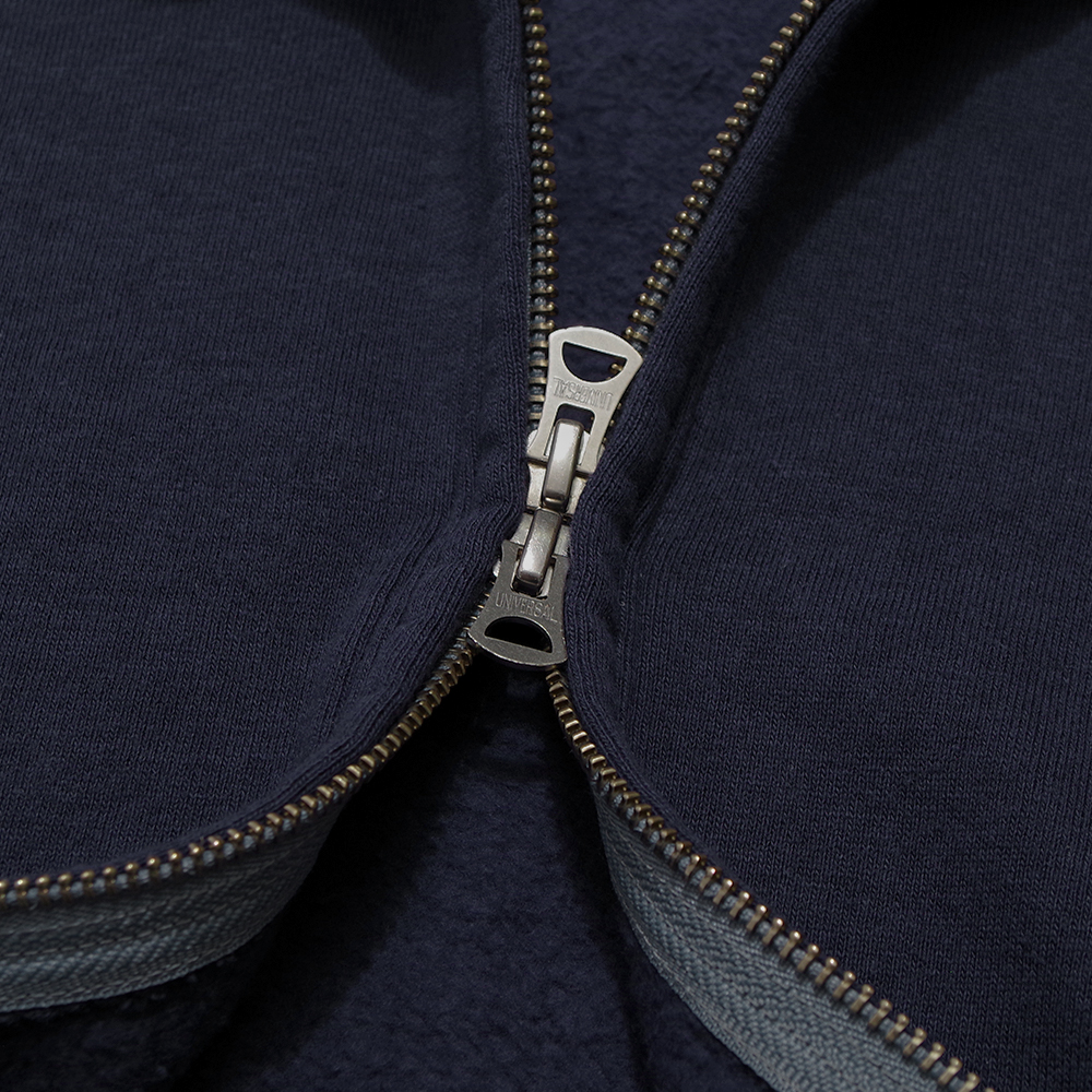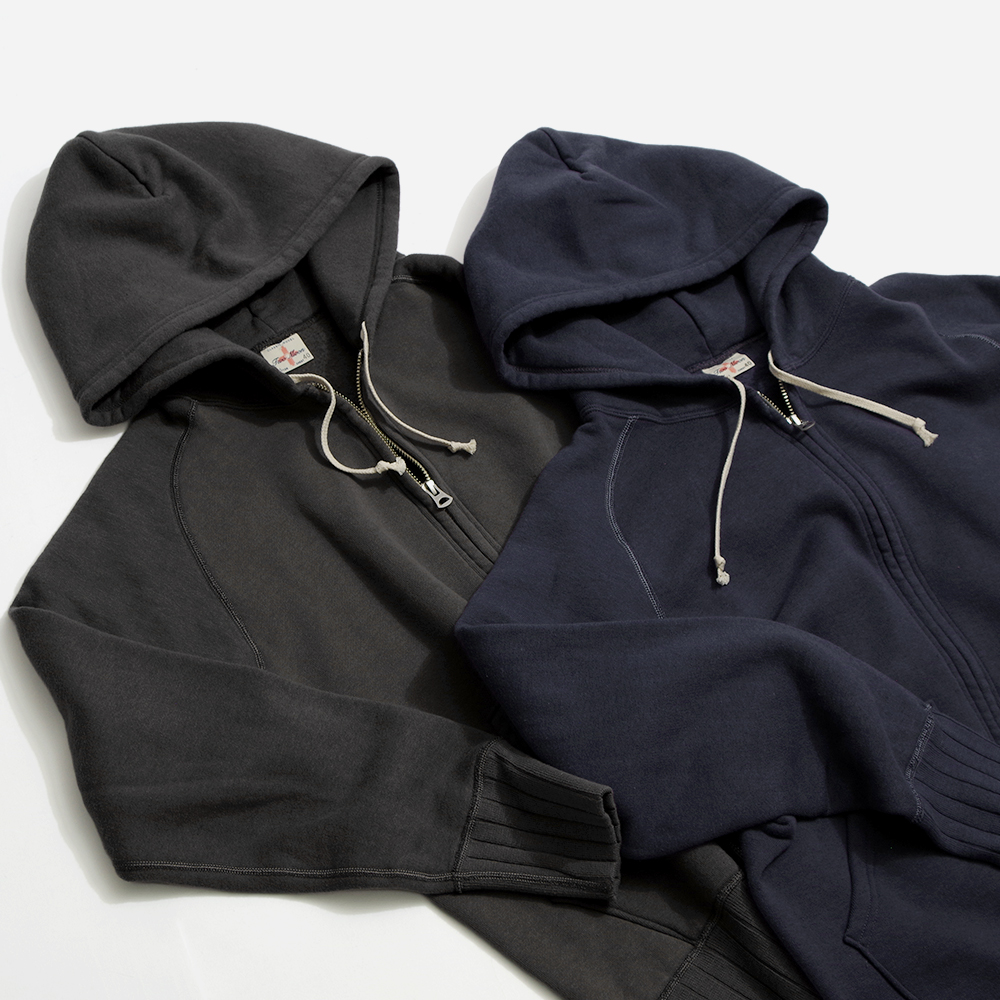 適度な肉厚ながらふわっとした素材感でアウターにもインナーにも使い勝手の良いフルジップパーカとしてオススメの逸品です。