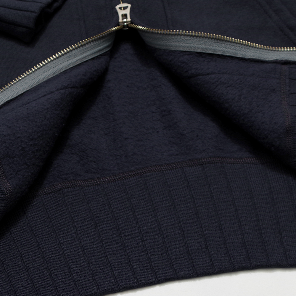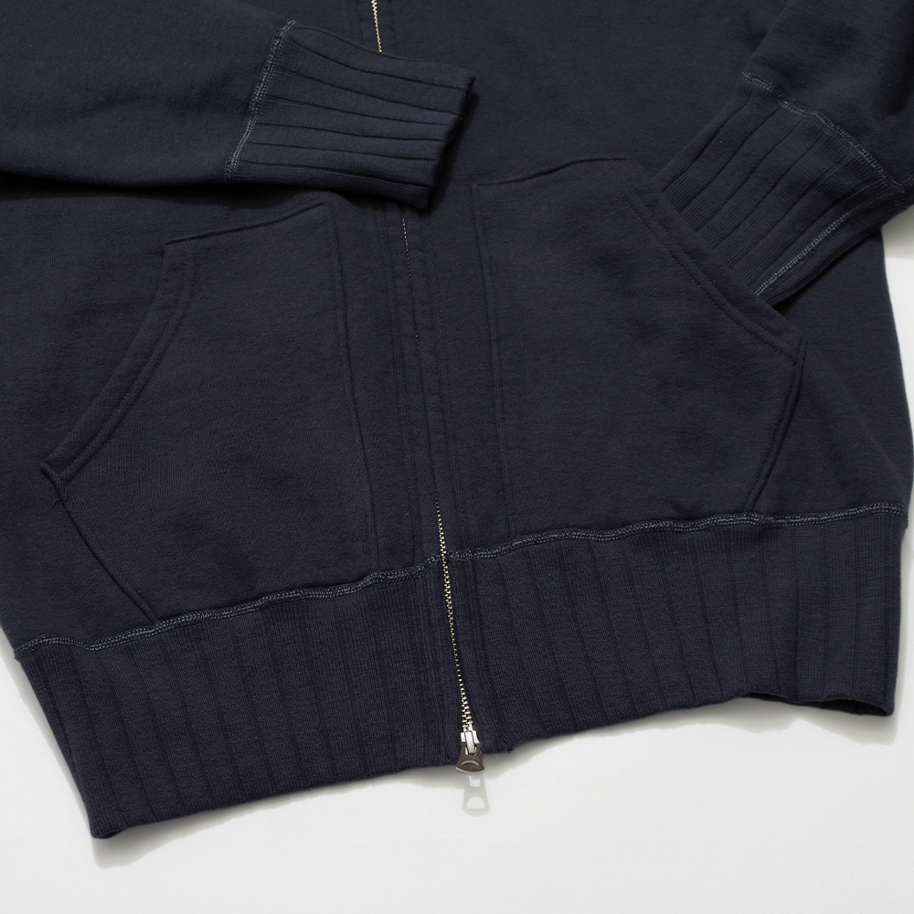 ディテール1940年代頃のスウェットシャツにみられる袖と身頃を曲線で縫製したフリーダムスリーブを採用、リブは針抜きリブでフロントポケットはジップからやや離れたセパレートポケットになっています。