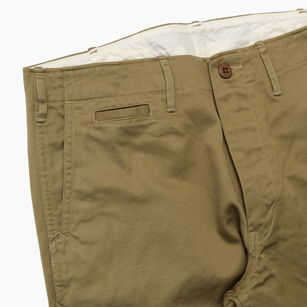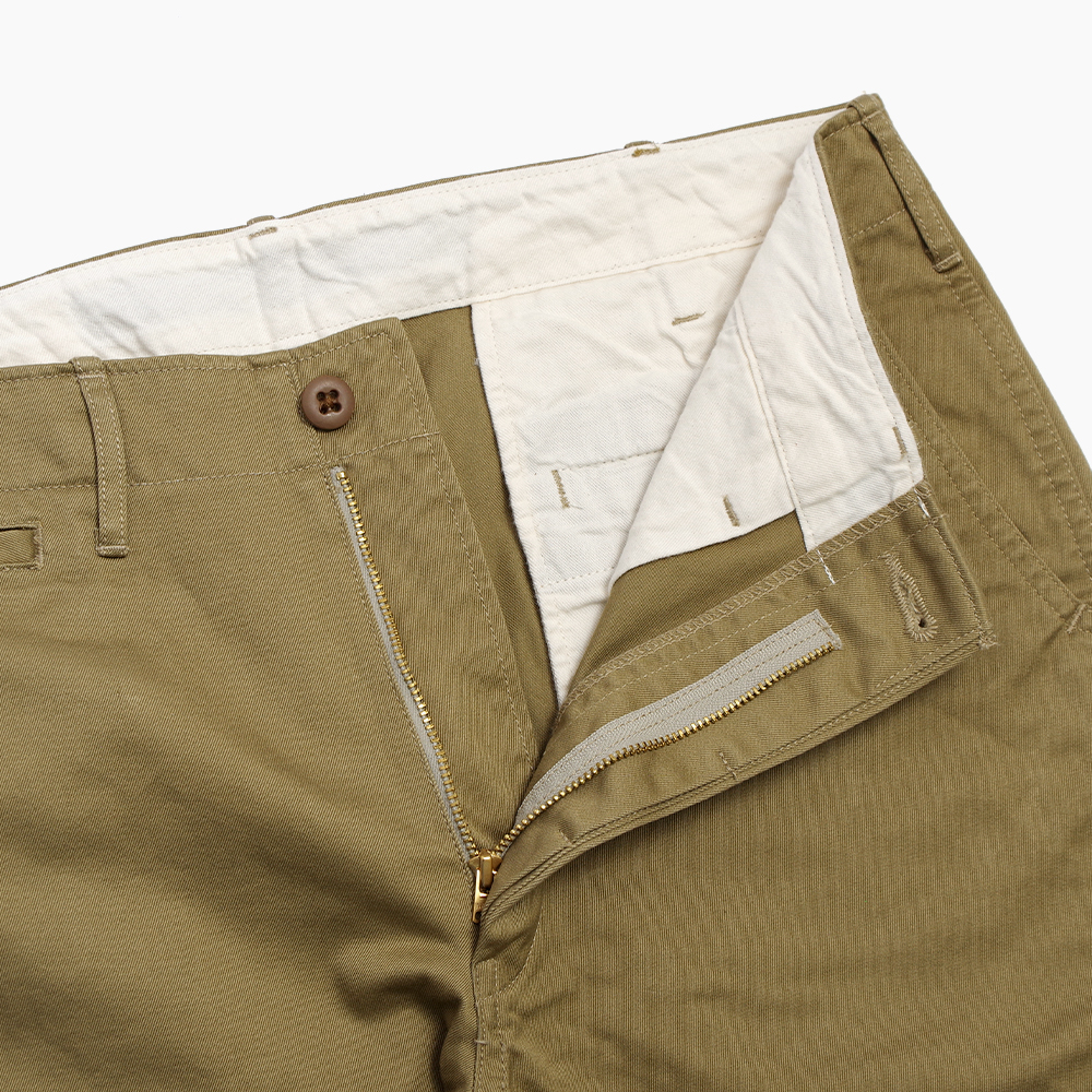 高密度に織りあげたオリジナルのコットンツイル地はハリがあり、独特の光沢と穿き込むことによる経年変化で、上品な大人のチノパンといった雰囲気です。