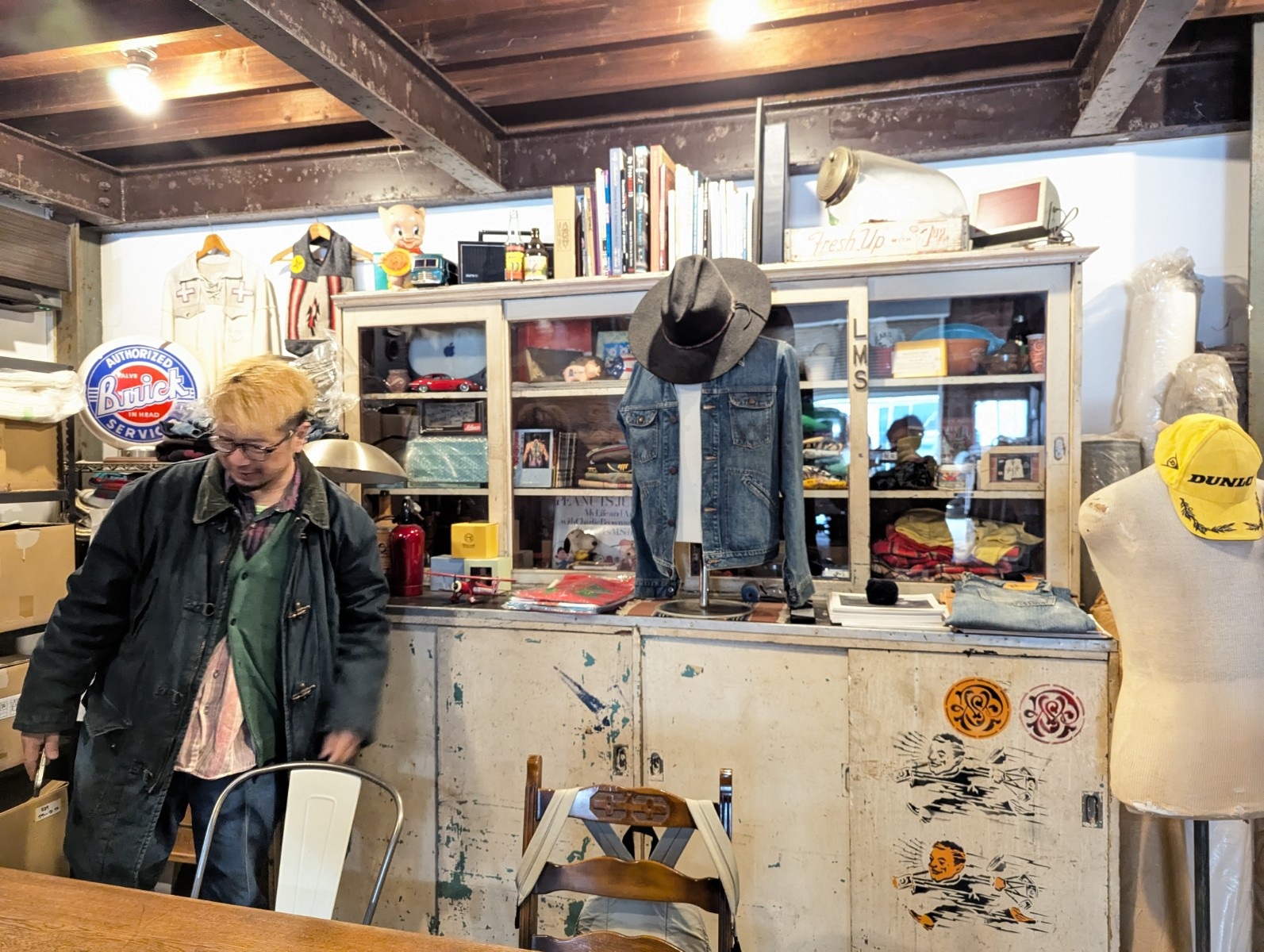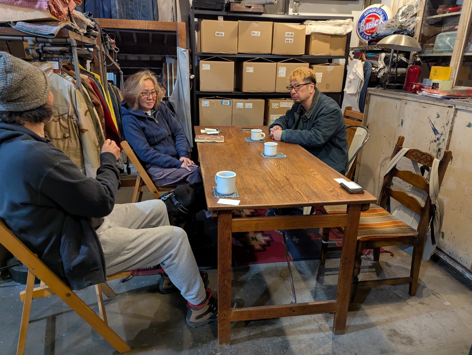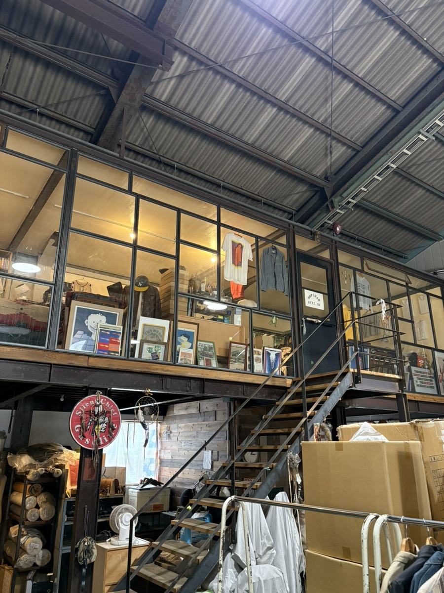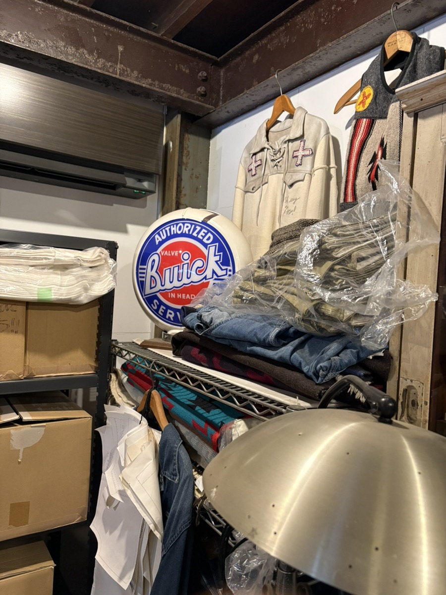 ミーティングルームの周りにはこれまで収集してきたヴィンテージウェアや雑貨が所狭しと置かれています。今まで製作してきた商品のサンプルであったりするものから、社長本人が愛してやまない『アメリカ』を感じさせてくれる色んなモノがそれはもう無造作に。僕からしたらお宝の山でした笑