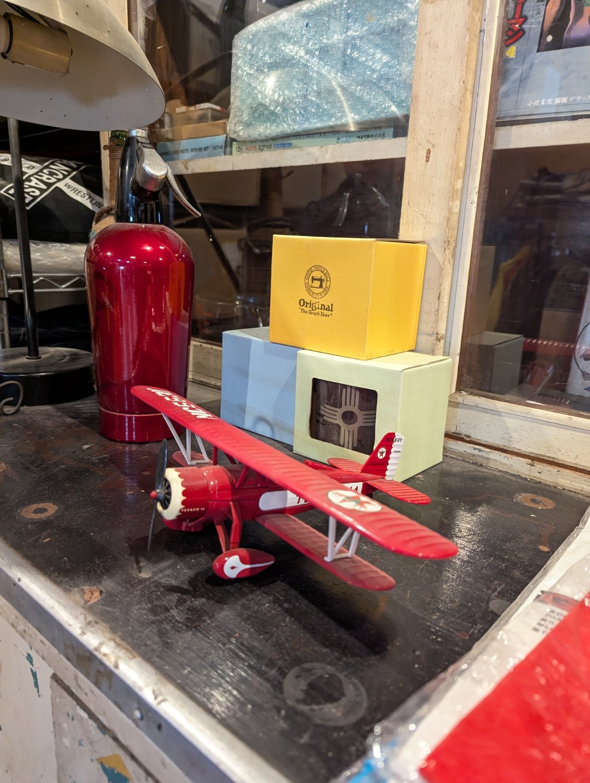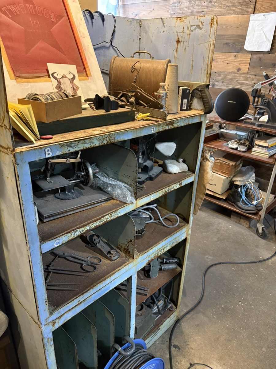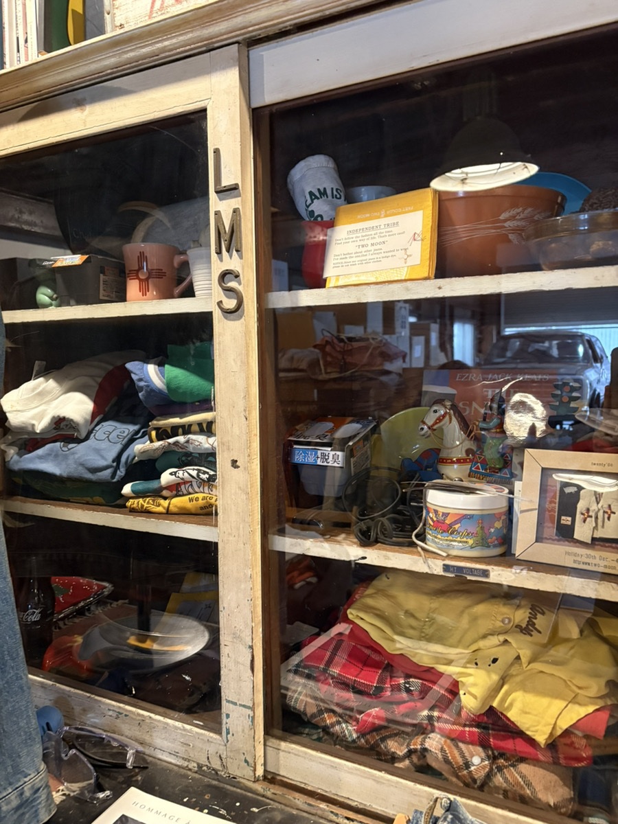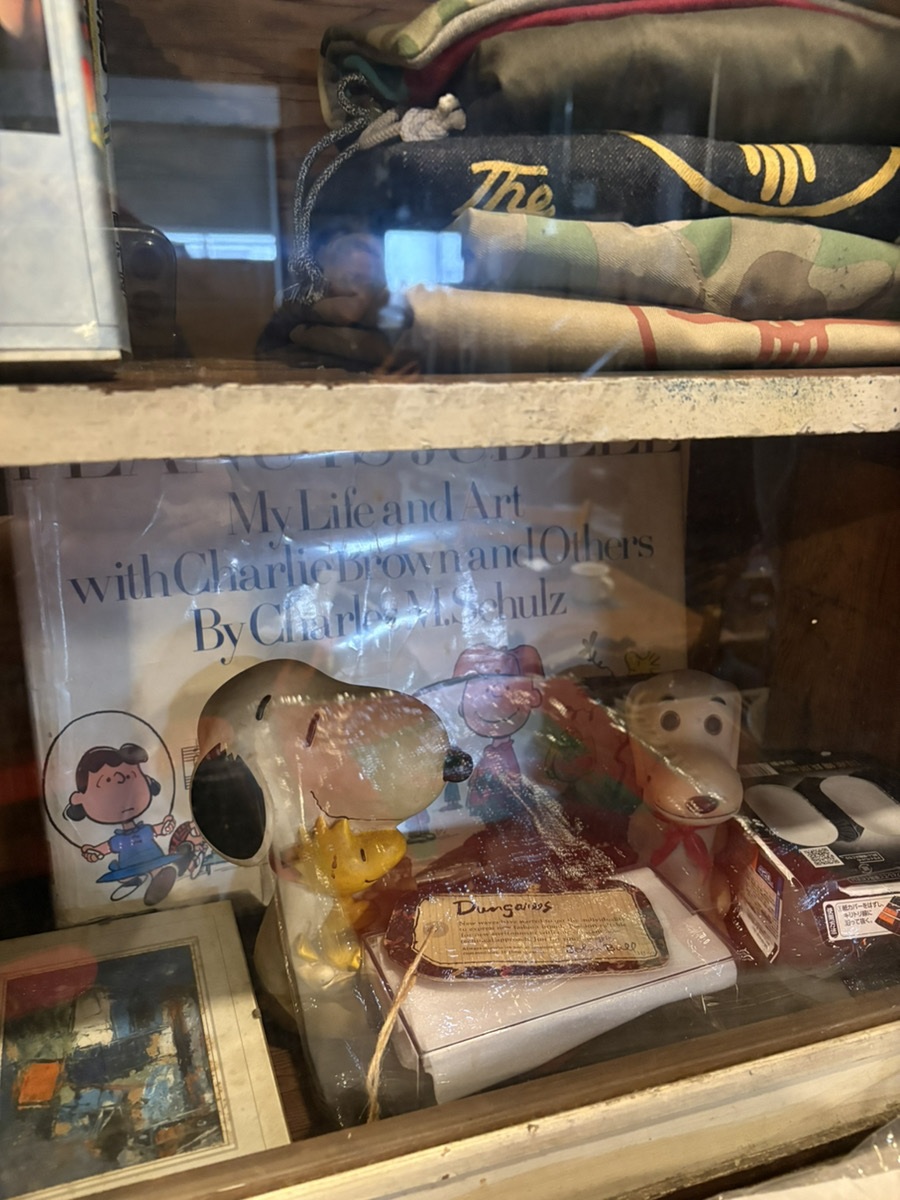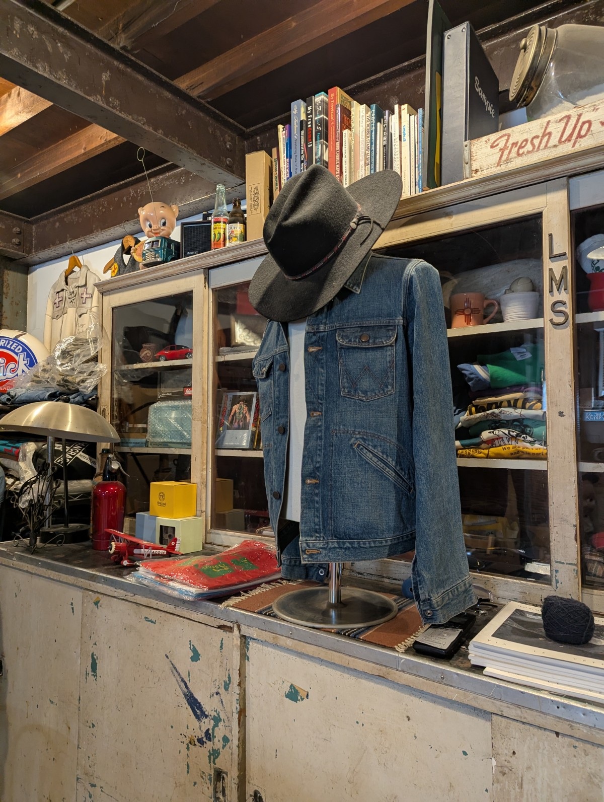 ミーティングルームの周りにはこれまで収集してきたヴィンテージウェアや雑貨が所狭しと置かれています。今まで製作してきた商品のサンプルであったりするものから、社長本人が愛してやまない『アメリカ』を感じさせてくれる色んなモノがそれはもう無造作に。僕からしたらお宝の山でした笑