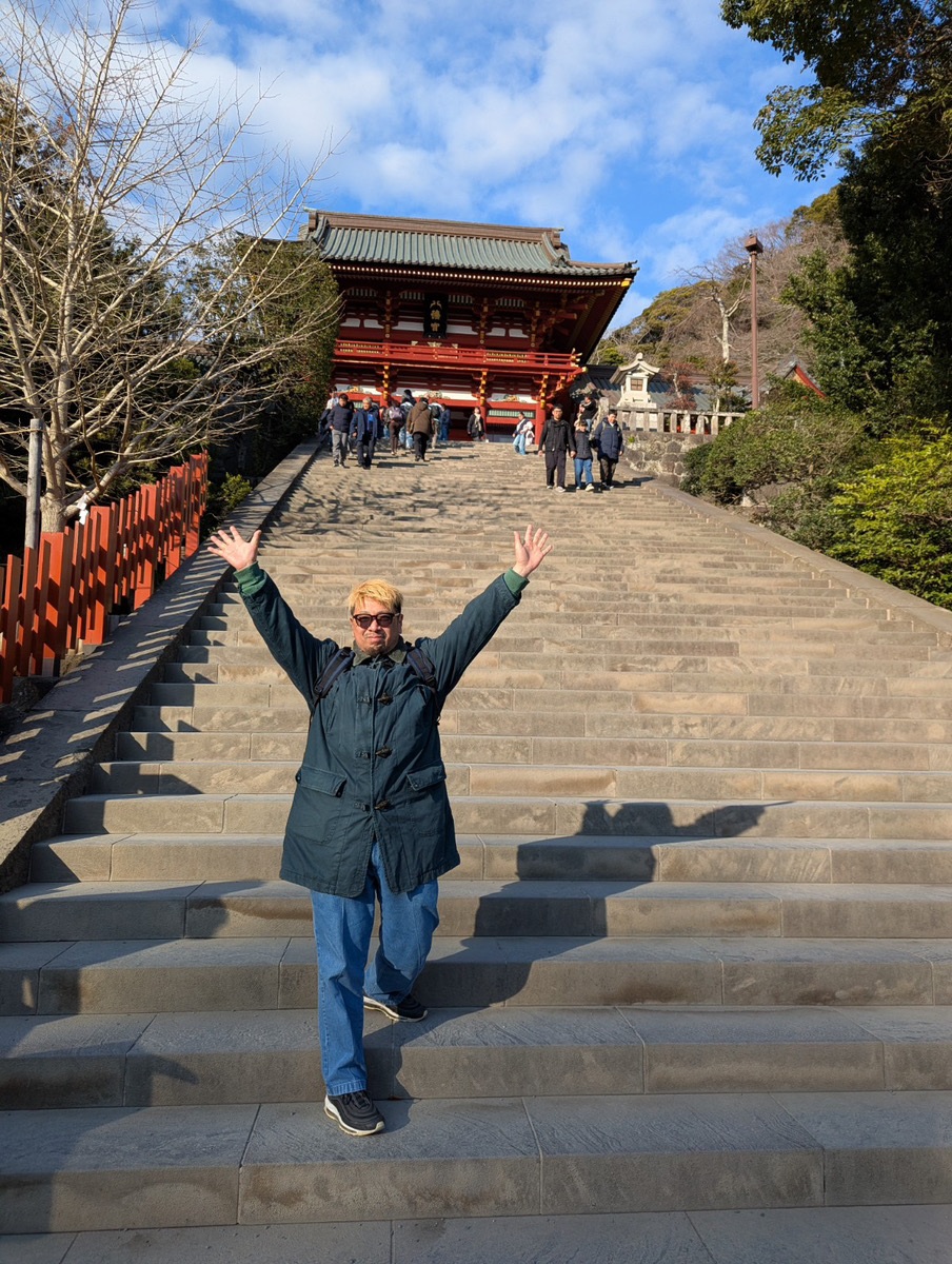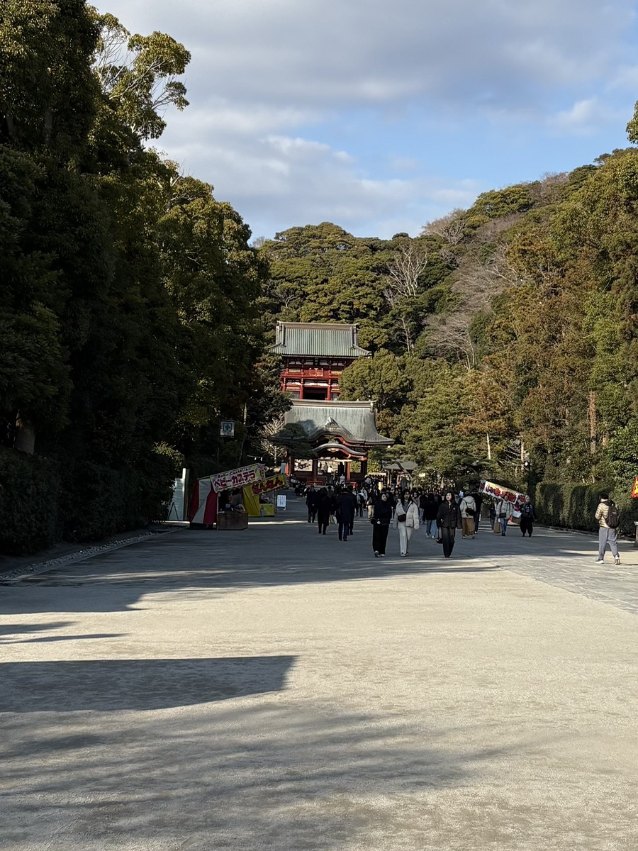 そして、帰りは来た時とは違うルートで。湘南海岸に沿って走る江ノ島電鉄に乗って藤沢から鎌倉まで40分ほど。途中スラムダンクの聖地の鎌倉高校前駅を素通りして、あ、ここが稲村ジェーンのとこかぁとか思いながら終点鎌倉へ。せっかくなので有名なパワースポットである「鶴岡八幡宮」にて商売繁盛を祈願してきました。