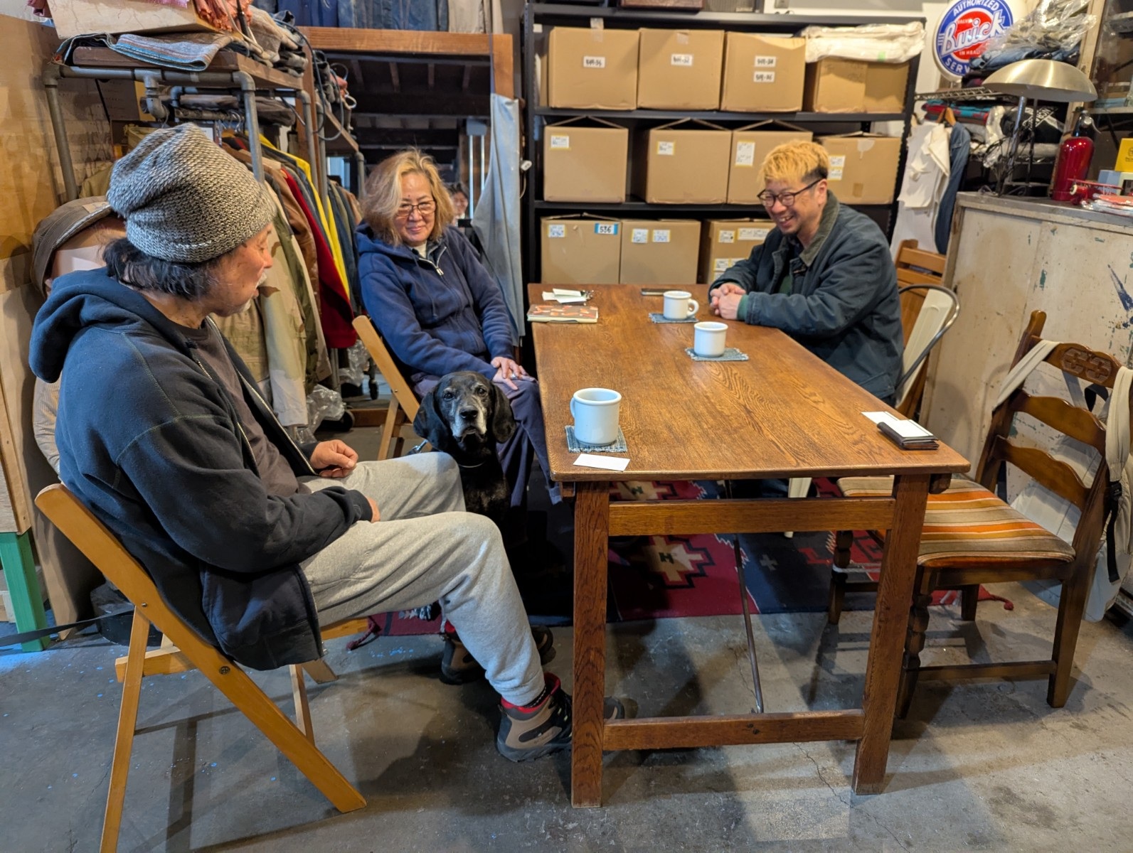 奥のミーティングルームでは今後の別注企画や現状のブランドの体制、社長の平川さんの物作りに対するこだわりなどじっくりお話させていただきました。また、いつも電話で対応していただいている奥に写る石川さんとも社長同様久しぶりにお会いさせていただきました。あ、そうそう、この真ん中でこちらをカメラ目線で見ているワンコの話もじっくり伺いました。すごく感銘を受けた話ですが長くなるのでここでは割愛。興味のある方はLIME ON STOREにお越しいただければお話させていただきます。大変だったようです。